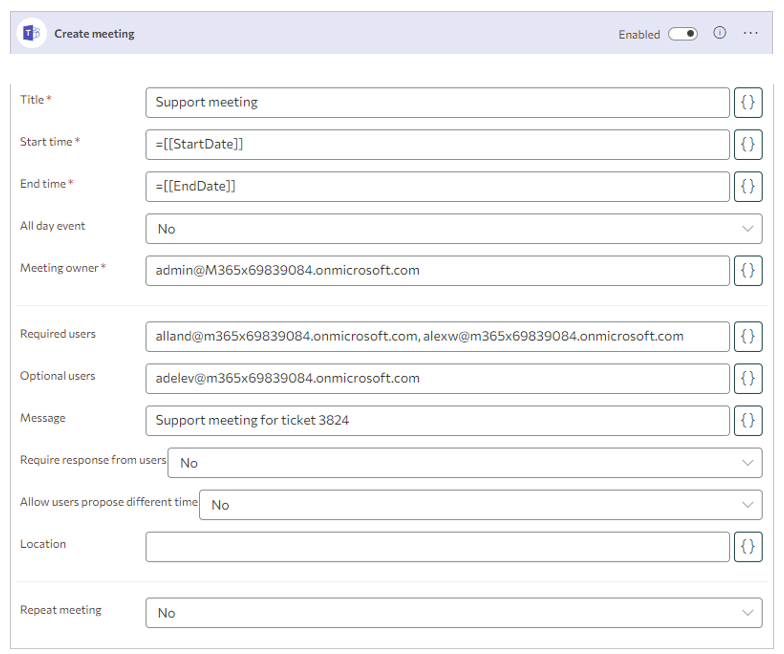 Endzeit des Treffens. Datum und Uhrzeit im Format 'yyyy-MM-ddTHH:mm:ss'. Hinweis: Wenn ein benutzerdefiniertes Datum verwendet wird, wird die Zeitzone aus den SharePoint-Regionaleinstellungen übernommen. Außerdem können Sie Funktionsplatzhalter verwenden: UTCToLocalTime oder LocalTimeToUTC |