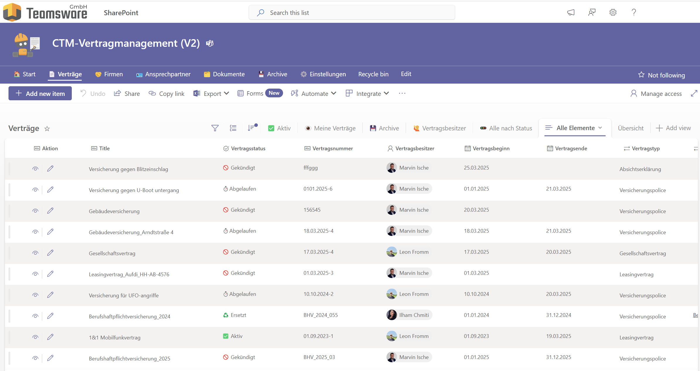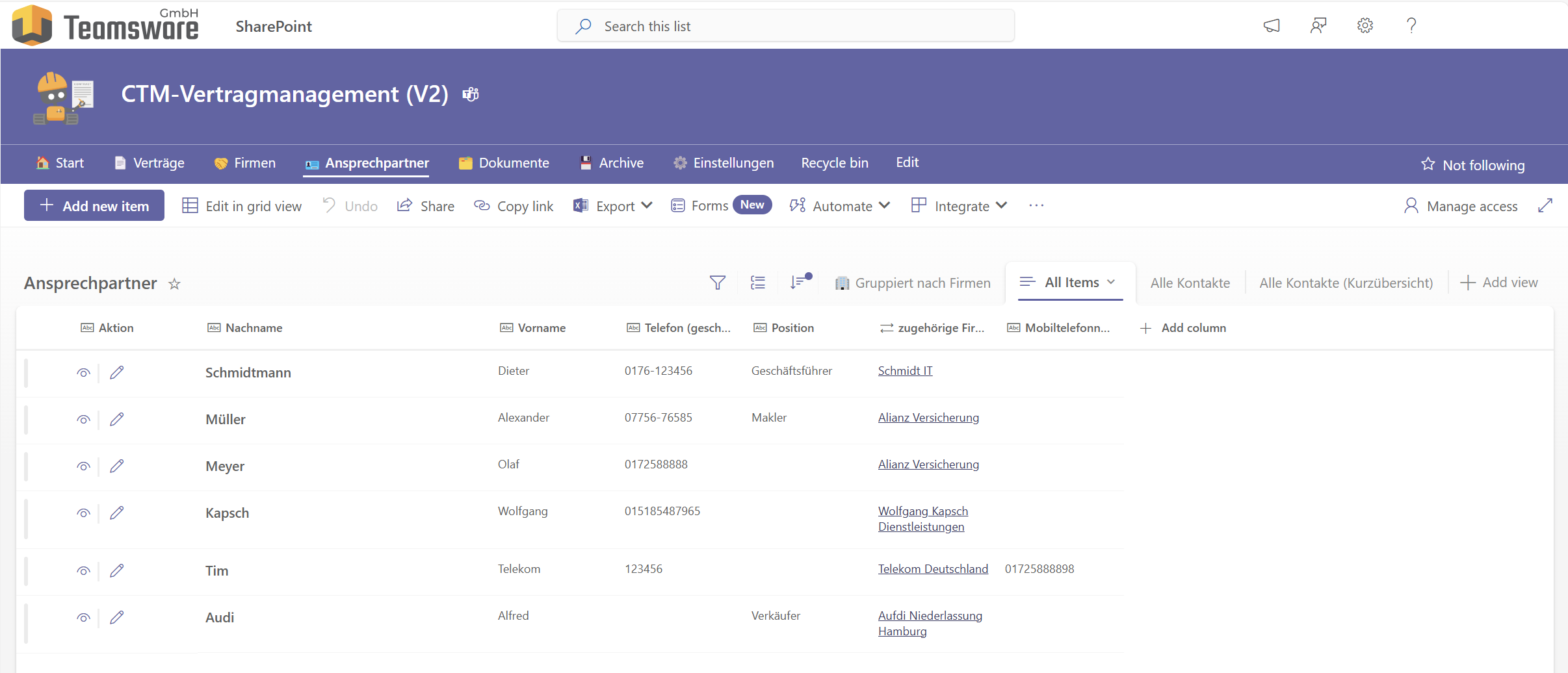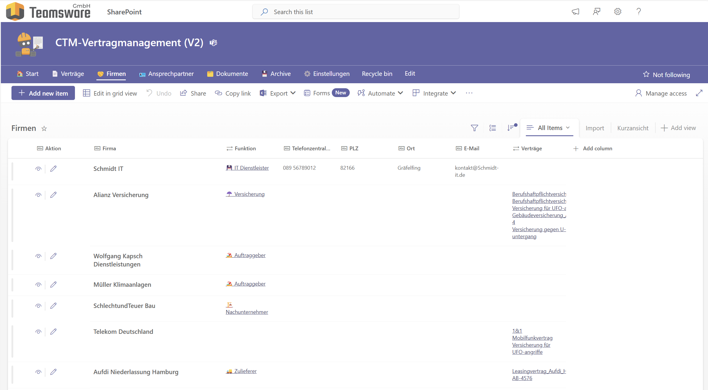 - View summaries of : all contracts and their owners (Vertragsbesitzer), existing companies (Firmen) and all current contacts (Ansprechpartner)