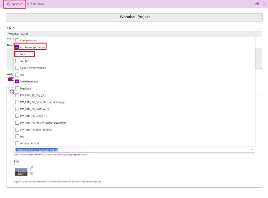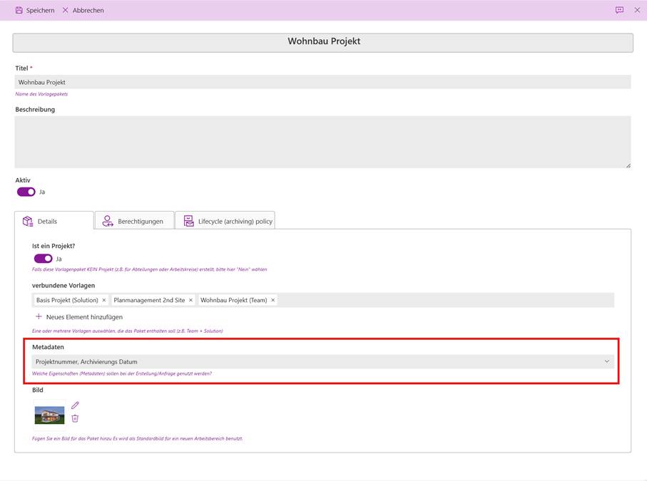 Sie in den Einstellungen des Vorlagenpakets die verknüpften Metadaten aus.