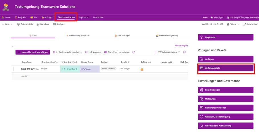 Ersteinrichtung eines Vorlagen-Pakets in der Teamsware-Bauakte