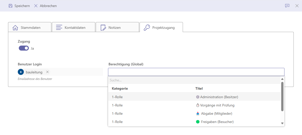 Durch das Zuweisen einer Rolle in der Ansprechpartnerliste wird der Benutzer automatisch im Hintergrund zur SharePoint-Berechtigungsgruppe hinzugefügt.
