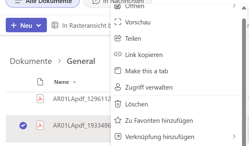Dateien, die für das ganze Team relevant sind, können als Registerkarte