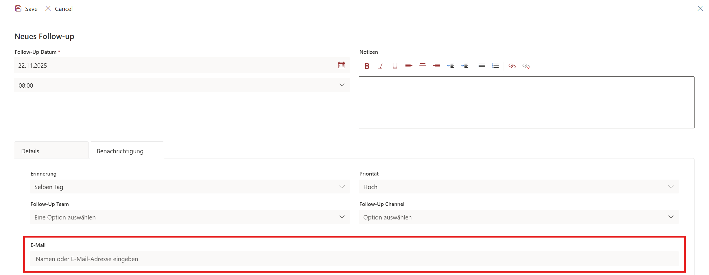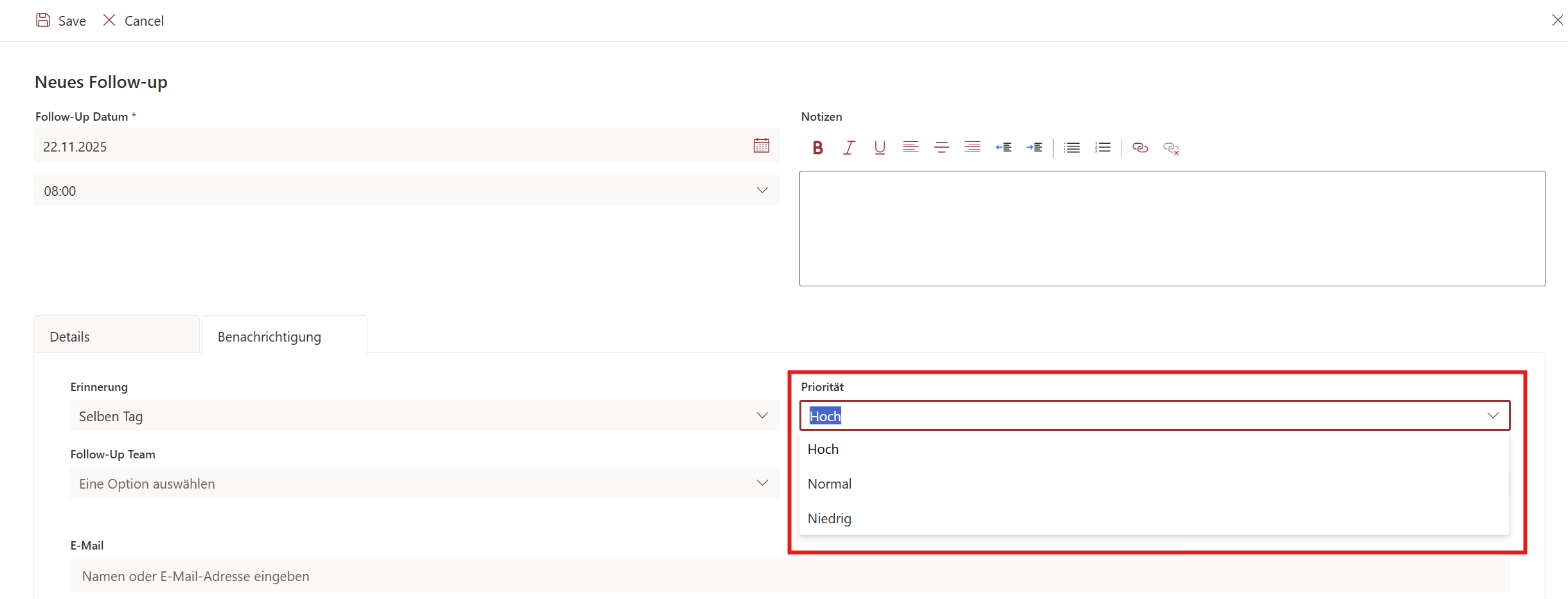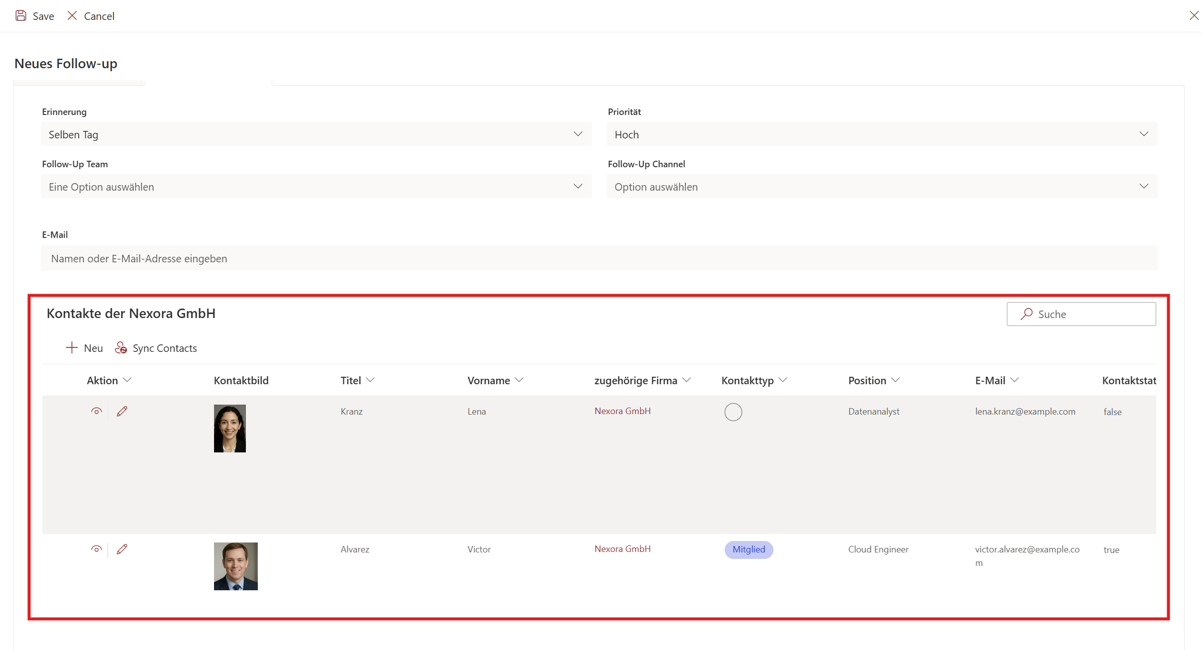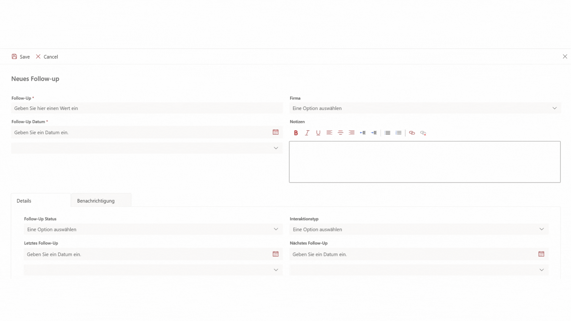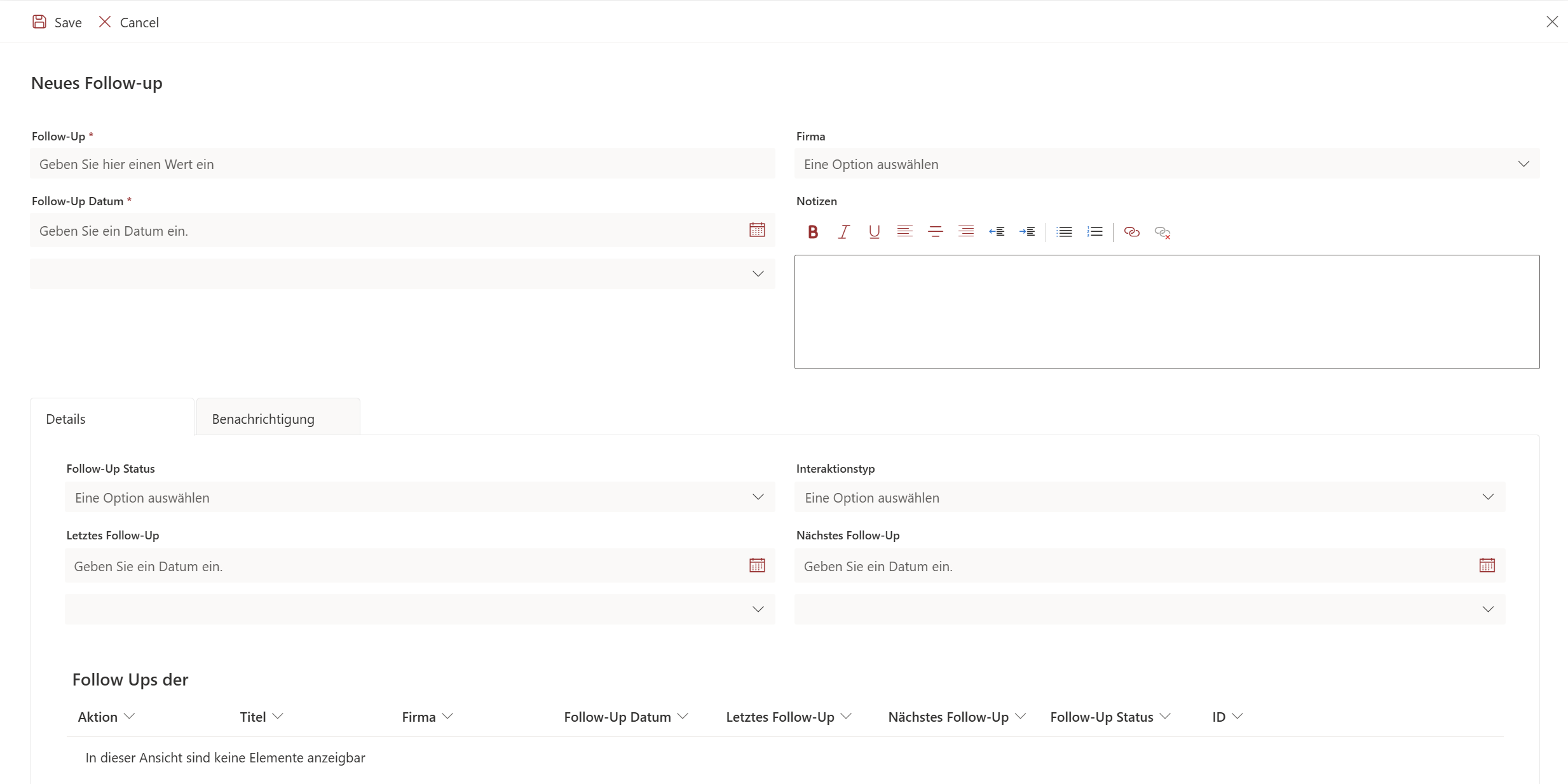 Sobald Sie eine Firma und ein Datum zuweisen, werden die beiden Felder „Letztes Follow Up“ und „Nächstes Follow Up“ automatisch ausgefüllt.