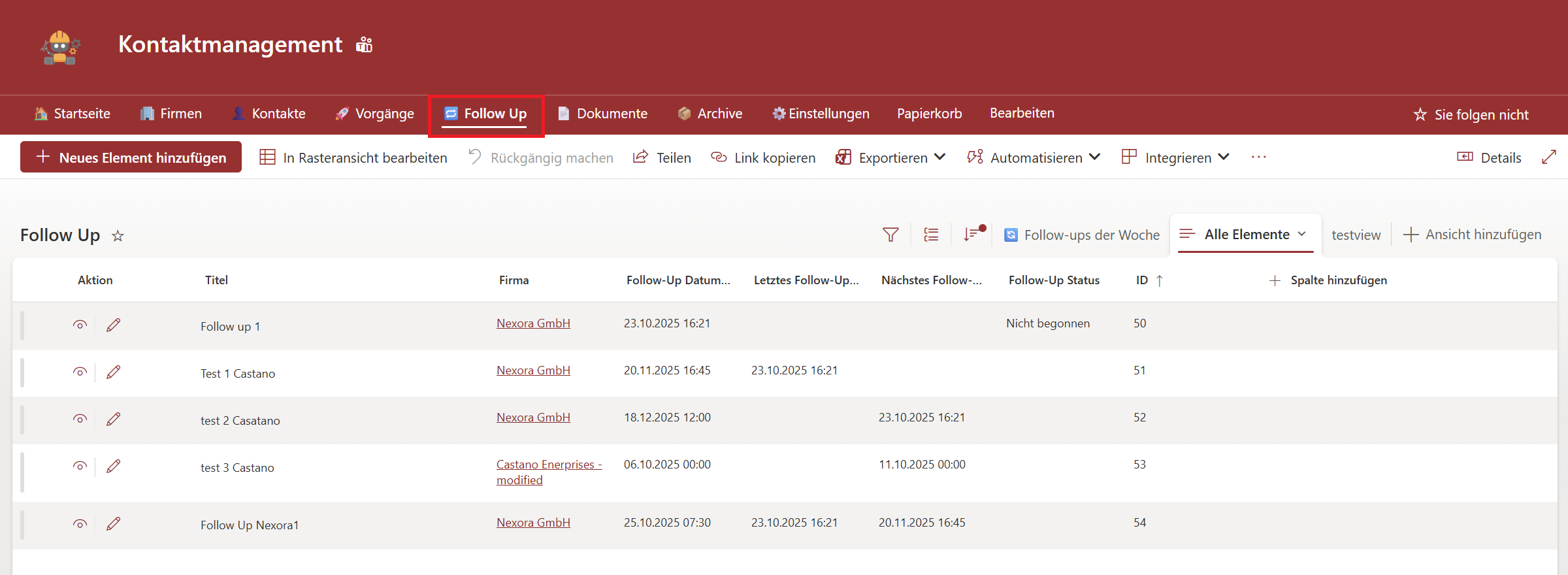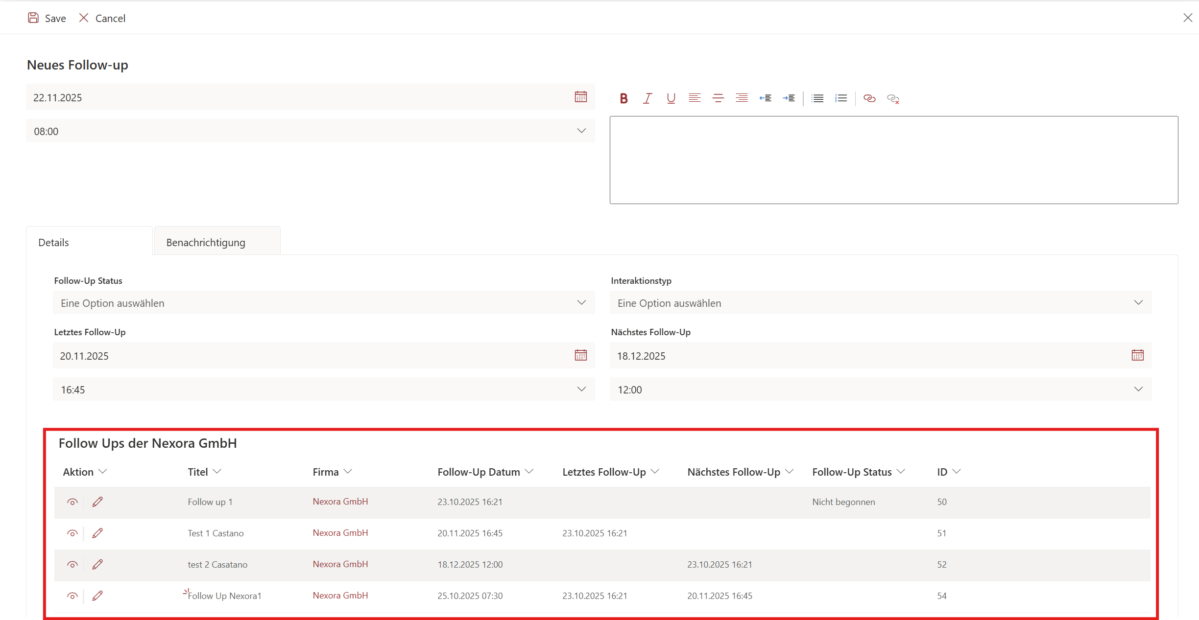 - Eine Liste zeigt alle bereits erstellten Follow Ups für die ausgewählte Firma an.