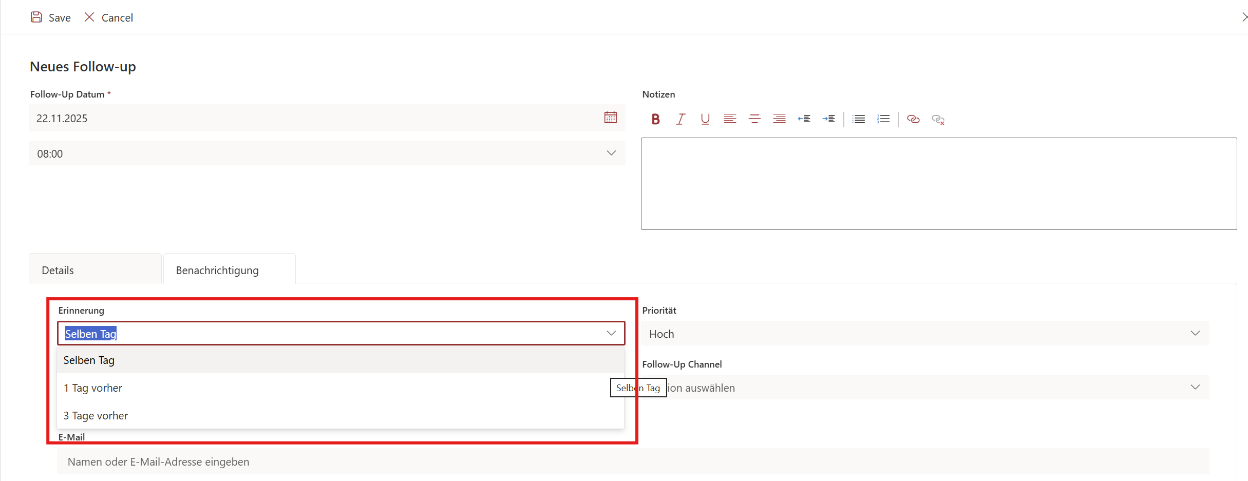 Diese Benachrichtigungen können über das Feld „Erinnerung“ zu einem gewünschten Zeitpunkt versendet werden. Zur Auswahl stehen die Optionen: