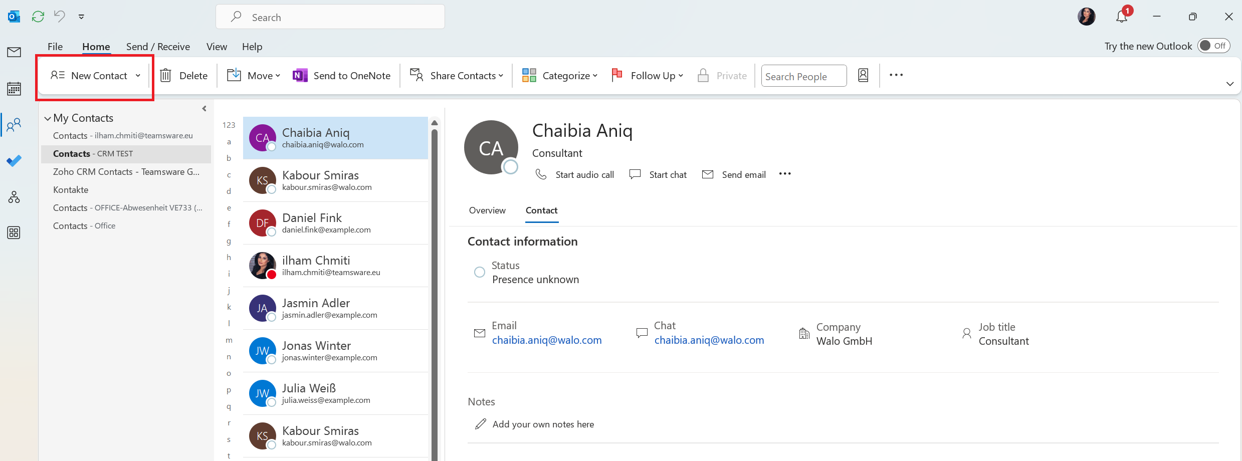 Wenn in Outlook eine Verteilerliste eingerichtet ist, die mit dem Kontaktmanagement-Modul verbunden ist, kann diese zum Erstellen neuer Kontakte verwendet werden. Dazu erstellen Sie einfach einen neuen Kontakt in Outlook, tragen alle erforderlichen Informationen ein, und nach der Synchronisierung wird dieser Kontakt automatisch in SharePoint erstellt.