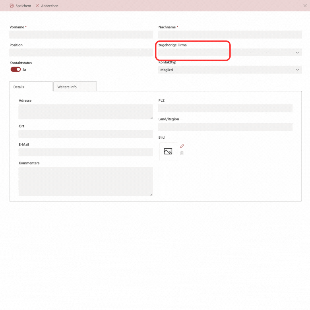 Wenn Sie im Feld „Zugehörige Firma“ eine Firma auswählen, wird die Adresse automatisch gemäß der gewählten Firma ausgefüllt.