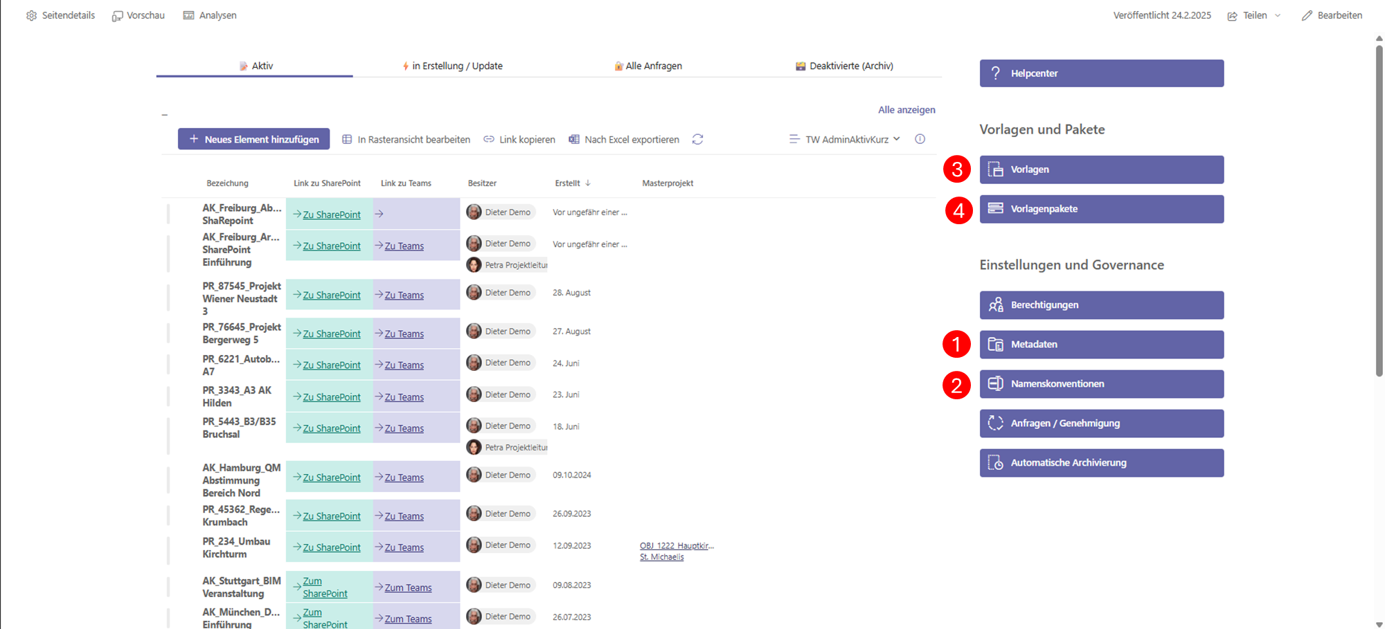 Nach Abschluss dieser Konfiguration verfügen Sie über ein einsatzbereites Vorlagen-Paket. Damit können neue Projekte standardisiert, einheitlich benannt und vollständig mit allen Strukturen und Apps auf Knopfdruck erstellt werden.