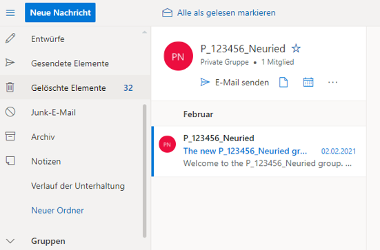 In Projekten (Teams), die über die digitale Projekt- und Bauakte erstellt wurden, wird die M365 Gruppe eines Teams in Outlook als Gruppe angezeigt.