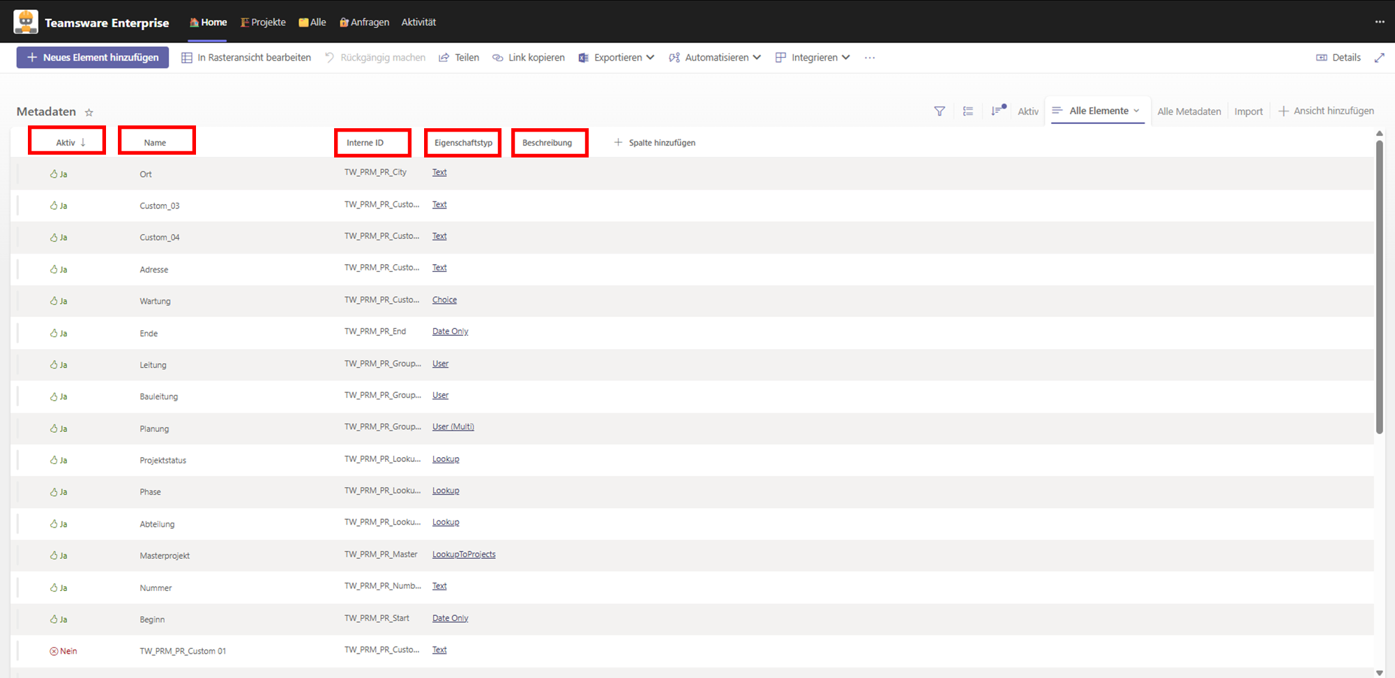 In der Teamsware-Bauakte spielen Metadaten eine zentrale Rolle für die Organisation Ihrer Projektdaten. In diesem Bereich können Sie alle Metadaten zentral verwalten, neue Felder hinzufügen und deren Verwendung steuern.