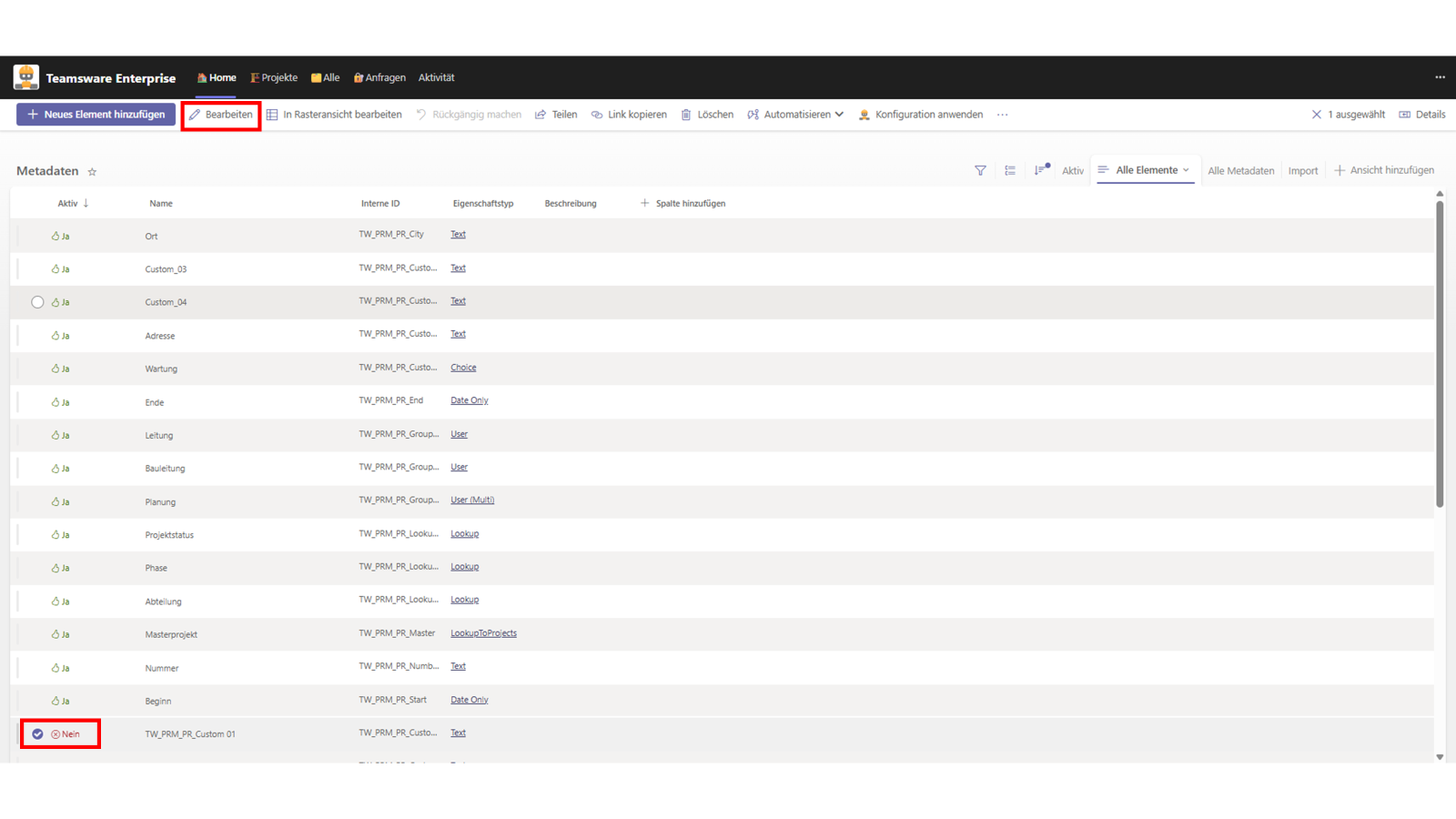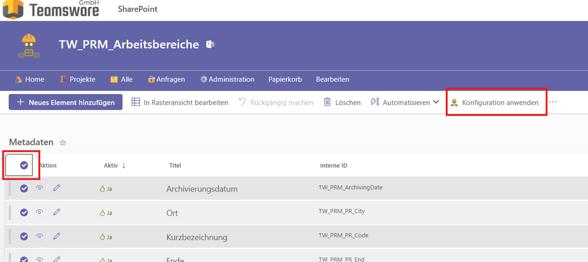 Nachdem Sie Änderungen an den Metadaten vorgenommen haben, müssen diese global aktiviert werden. Markieren Sie die bearbeiteten Felder (oder alle) in der Liste und klicken Sie zwingend auf den Button Konfiguration anwenden. Erst durch diesen Schritt werden die Änderungen systemweit übernommen.