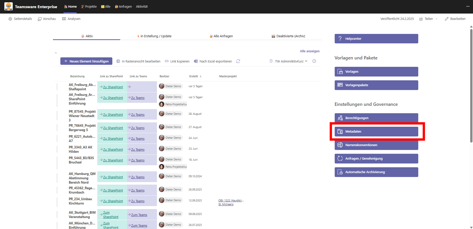 Um die Metadaten zu bearbeiten, navigieren Sie in den Admin-Bereich der Teamsware-Bauakte. Dort finden Sie unter dem Reiter „Einstellungen und Governance“ den Button Metadaten. Dieser Bereich ist essenziell, da aktivierte Metadaten-Felder später die Grundlage für Ihre Namenskonventionen bilden.