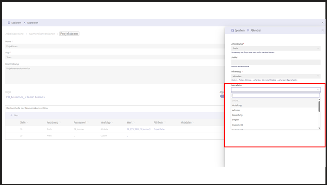 Wenn du Metadata als Inhaltstyp auswählst, öffnet sich eine Liste mit den verfügbaren Metadatenfeldern (z. B. Abteilung, Adresse, Bauleitung, Beginn).