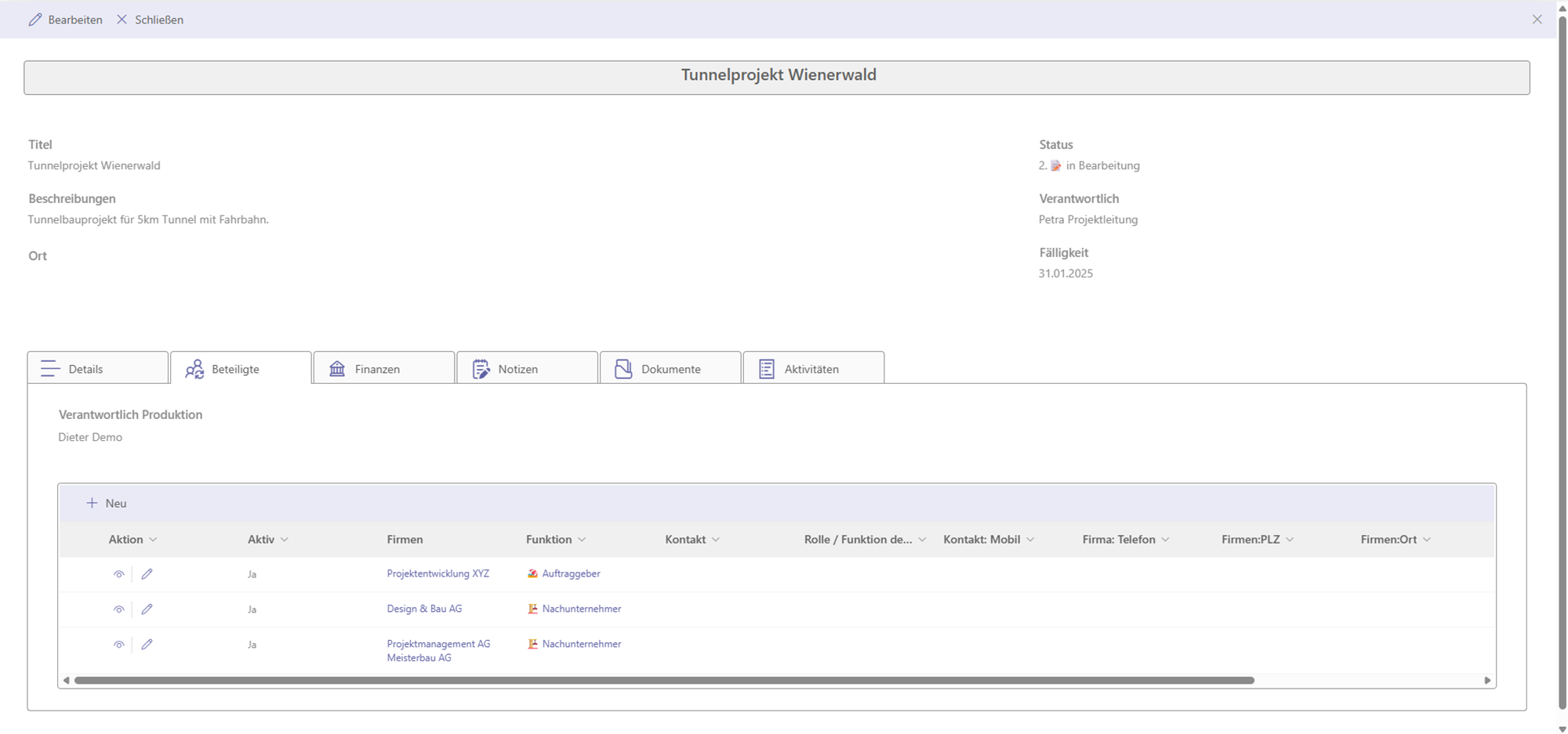 - Wähle über den Tab Beteiligte vorhandene Firmen aus dem zentralen Firmenregister aus.