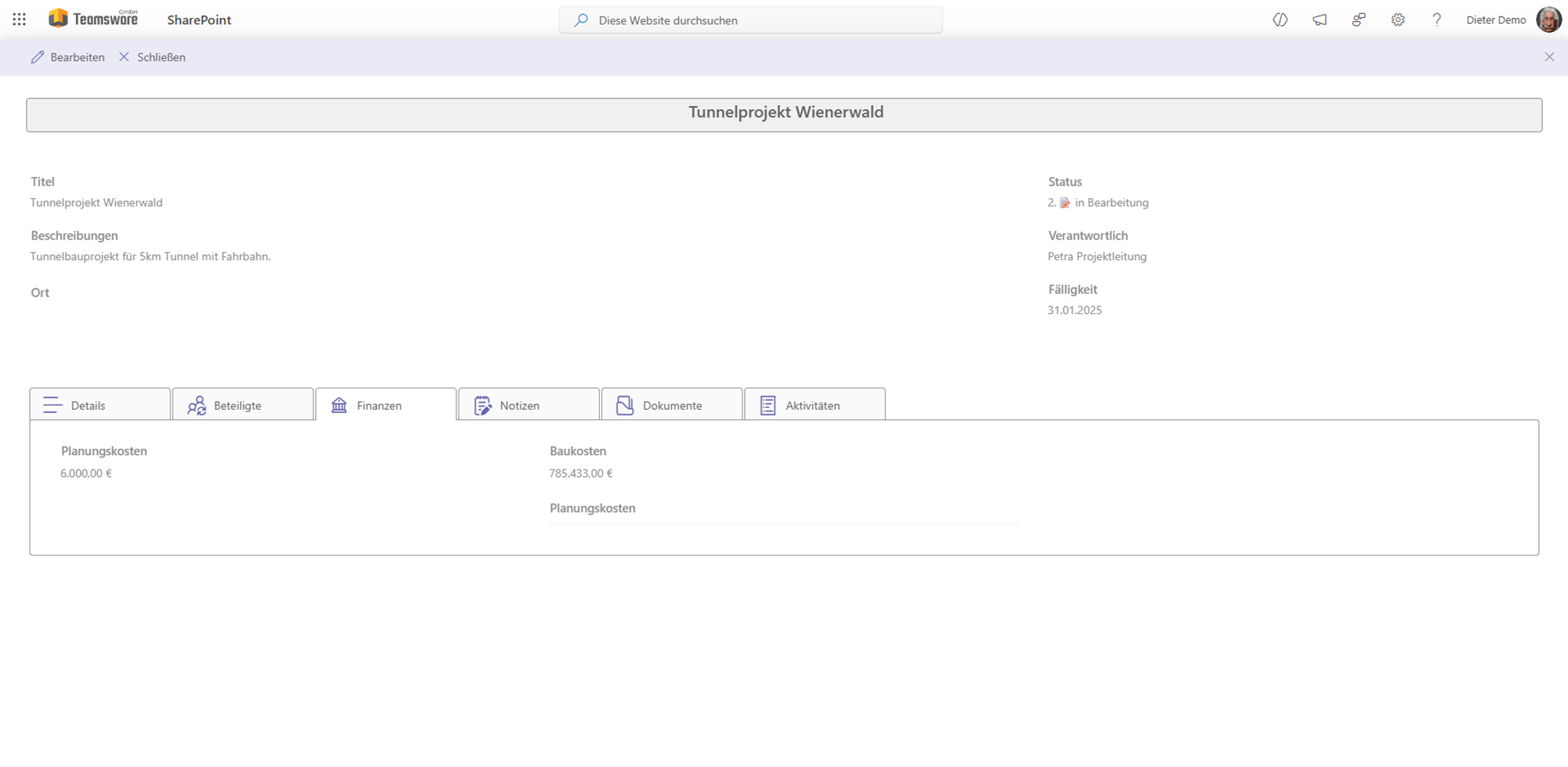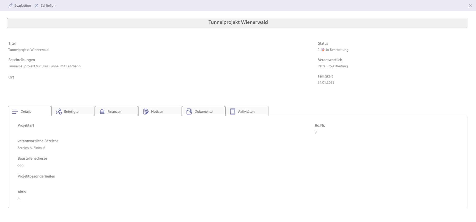 - Finanzen: Erfasse Planungskosten, Baukosten, Abschlagszahlungen und weitere Werte als Währungsfelder.