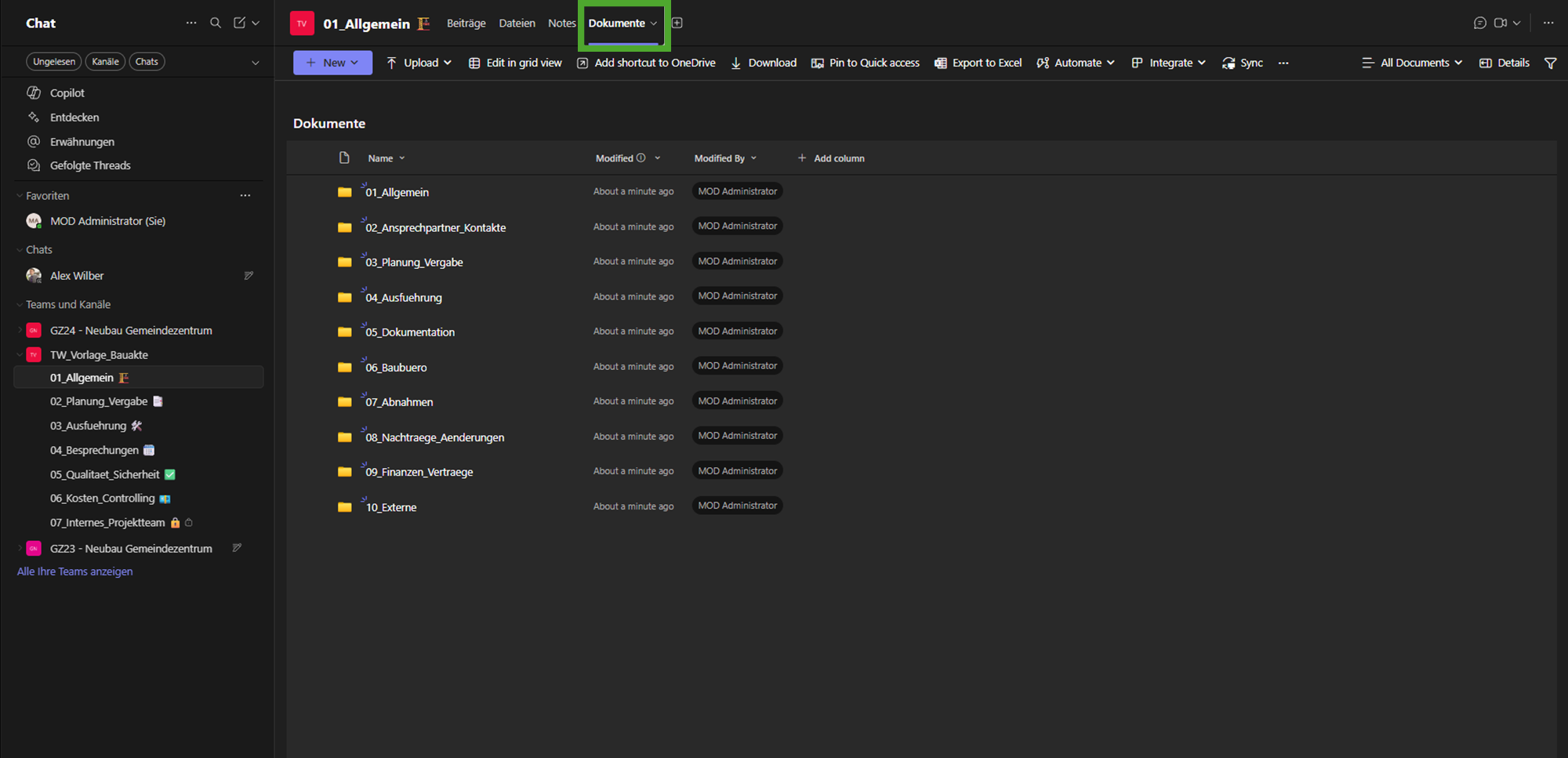 - 2. Ordnerstruktur in einem zusätzlichen Reiter: Um komplexe Berechtigungen (z. B. Schreibschutz auf Root-Ebene) zu ermöglichen, wird die Hauptstruktur oft in einem weiteren Reiter eingebunden. Dieser trägt Namen wie Dokumente, Projektablage oder Bauakten-Dokumente. In diesem Fall bleibt der Standard-Reiter „Dateien“ oft leer.