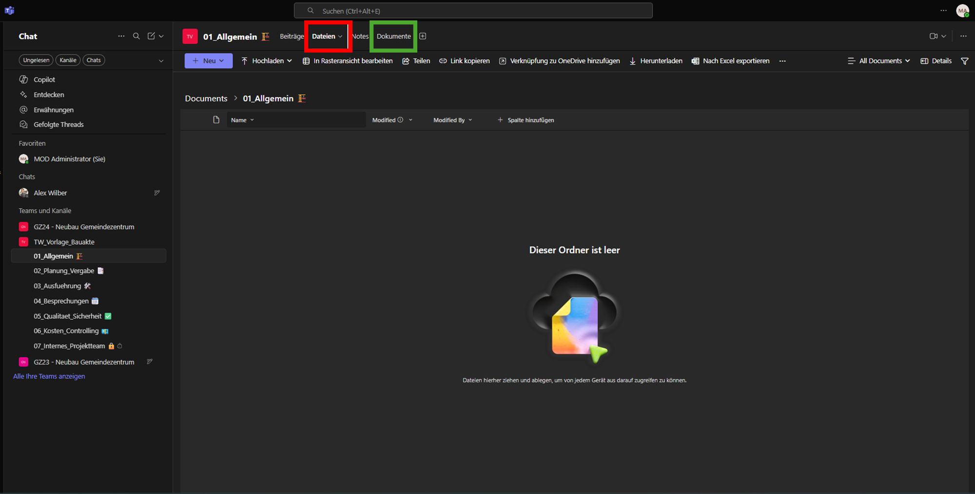 Eine leere Ansicht unter dem Reiter „Dateien“ bedeutet nicht, dass Inhalte fehlen oder gelöscht wurden. Aufgrund der Berechtigungskonfiguration liegen die Projektordner häufig in einem separaten Reiter. Prüfen Sie daher immer die obere Reiterleiste Ihres Kanals, um zur korrekten Struktur zu gelangen.