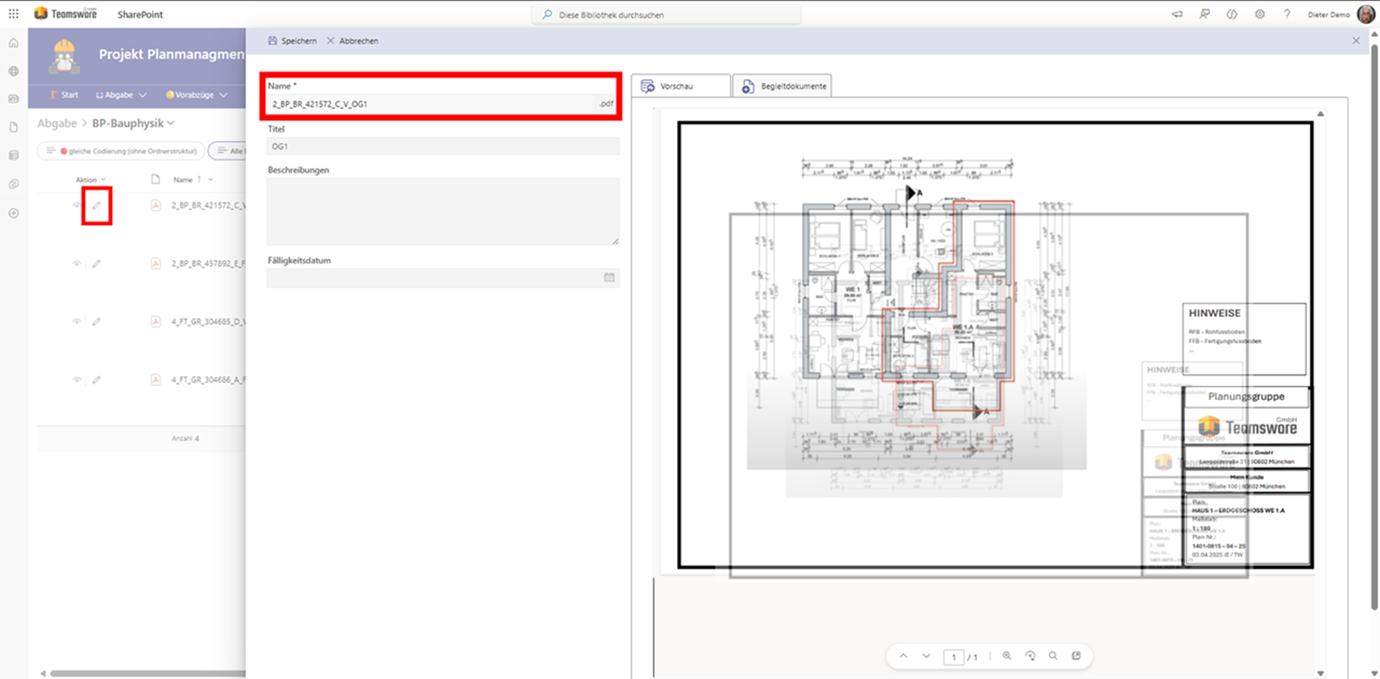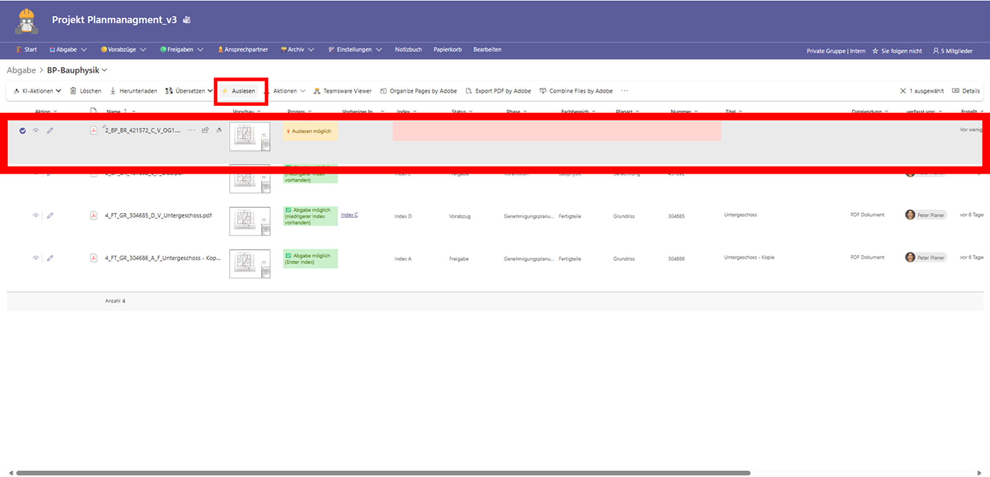 Mit der Drag & Drop-Funktion und dem Auslesen-Button kannst du Pläne schnell ins Teamsware Planmanagement importieren. Das System übernimmt dabei die lästige Arbeit, Metadaten wie Index und Planart einzutragen, automatisch. Sollte ein Dateiname einmal nicht passen, lässt er sich bequem über die Bearbeiten-Funktion korrigieren.