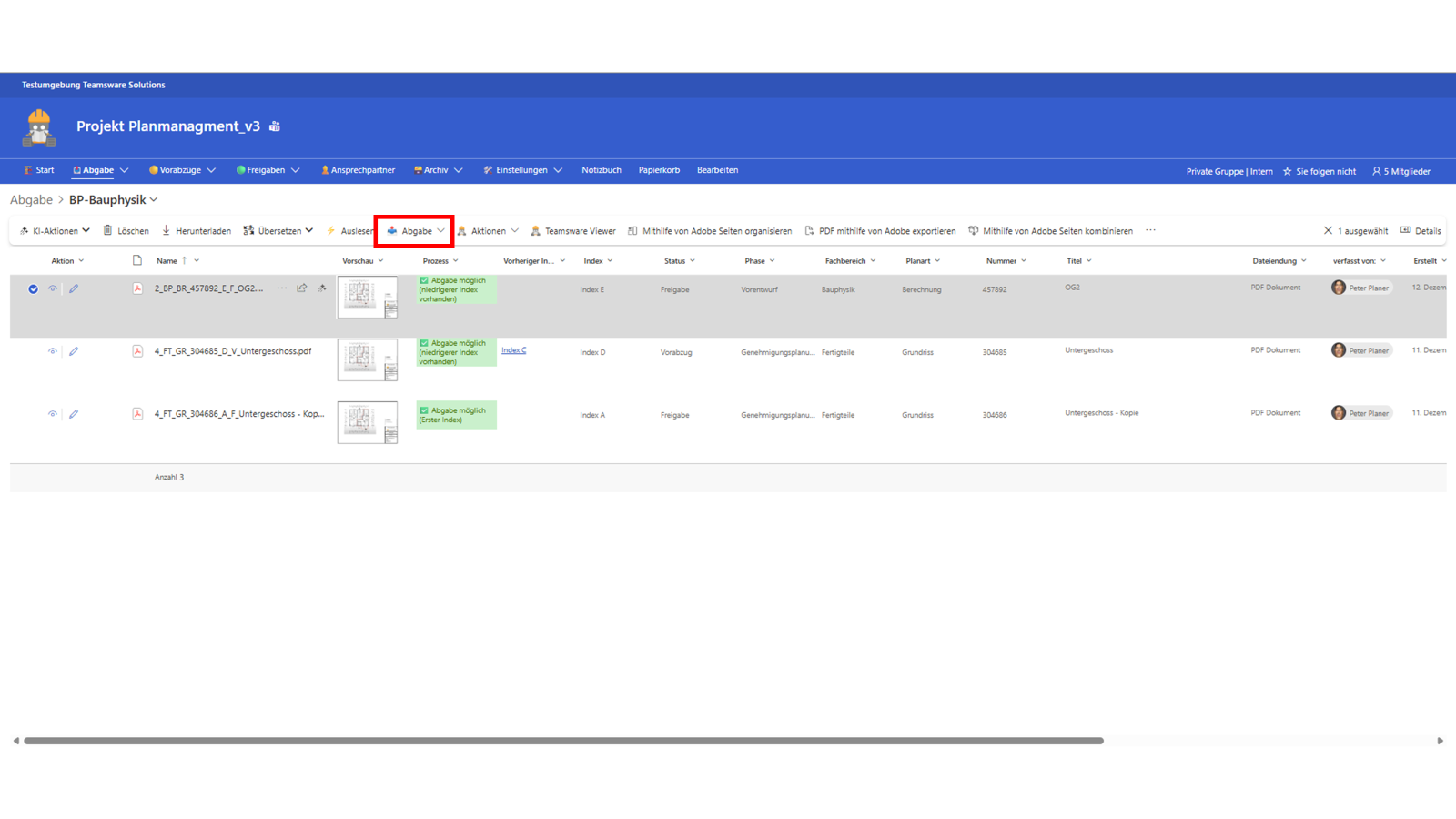 - Navigieren Sie zum Bereich Abgabe und wählen Sie den entsprechenden Gewerk-Ordner (z. B. Architektur, Bauphysik).