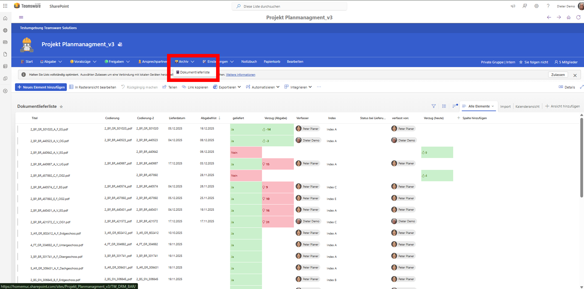 Behalten Sie den Überblick über Liefertermine und Verzug. Die Dokumentenlieferliste fungiert als kleines Projektmanagement-Tool.