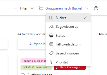 Gruppierungen | Ansicht nach z. B. „Zugewiesen zu“, „Fälligkeit“, „Fortschritt“ |