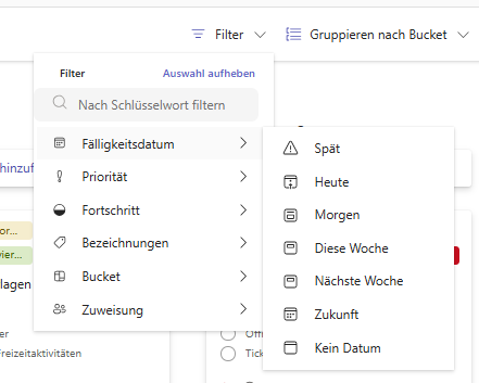 Filter | Zeigt nur Aufgaben mit bestimmten Eigenschaften – z. B. „Heute fällig“ oder „Meine Aufgaben“ |