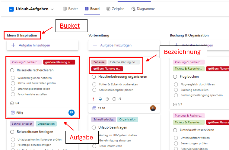 Du sortierst Aufgaben in Spalten (Buckets), markierst sie mit farbigen Bezeichnungen 🎨 und teilst sie automatisch mit deinem Team 👨👩👧👦.