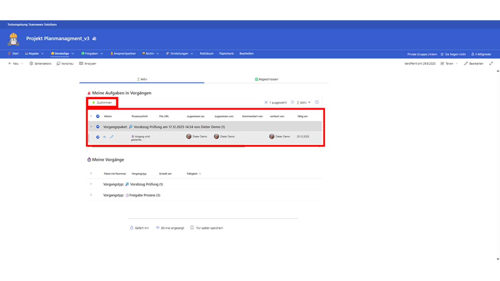 - Zustimmen: Der Workflow wird erfolgreich abgeschlossen. Der Plan wird, je nach Einstellung, automatisch in den Zielordner (z. B. „Freigabe“) verschoben.