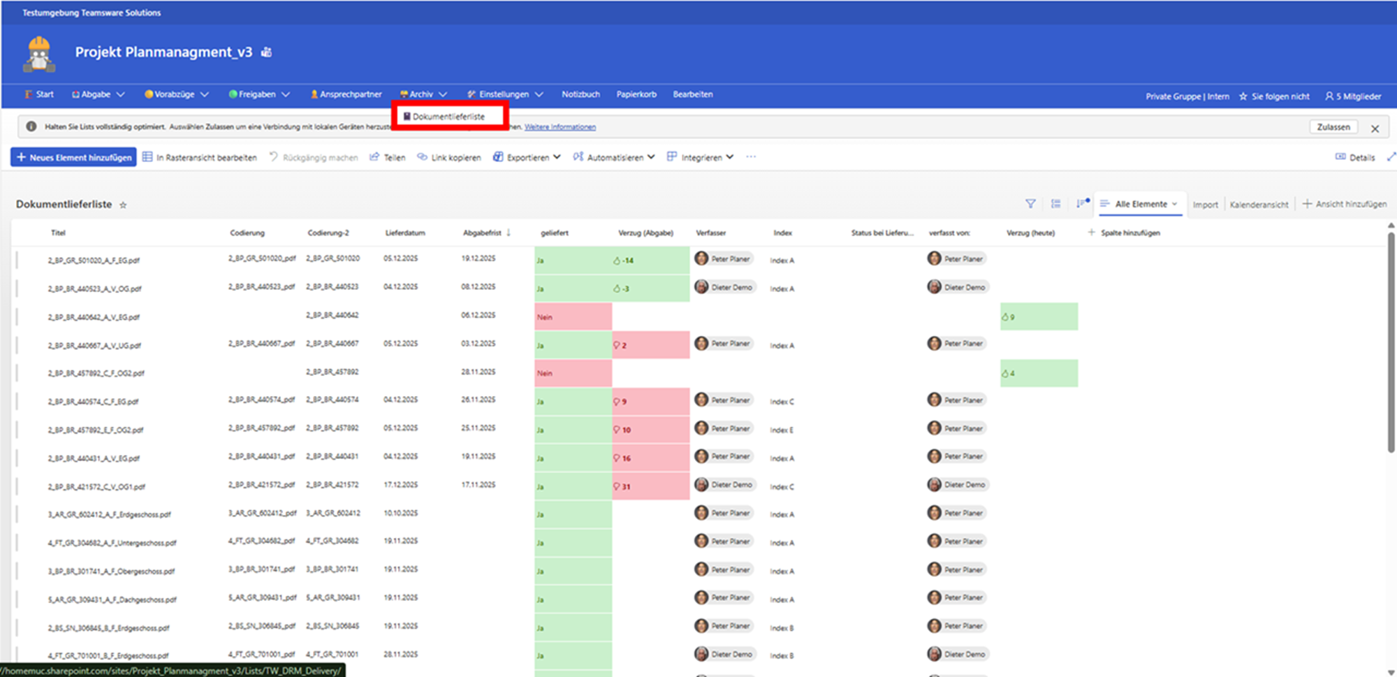 - Dokumentenlieferliste: Hier sehen Sie eine detaillierte Auflistung, wann welcher Plan geliefert wurde, wann die ursprüngliche Frist war und ob es einen Zeitverzug gab (automatische Berechnung der Verzugstage).