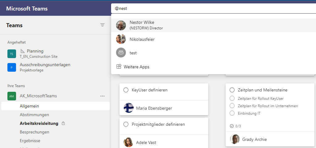 Egal in welchem Team, Kanal oder Registerkarte (Planner, Notizbuch, etc.) man sich befindet, man kann ohne Wechsel in die Chat-App über die Suchzeile mit @ Schnellnachricht schreiben.