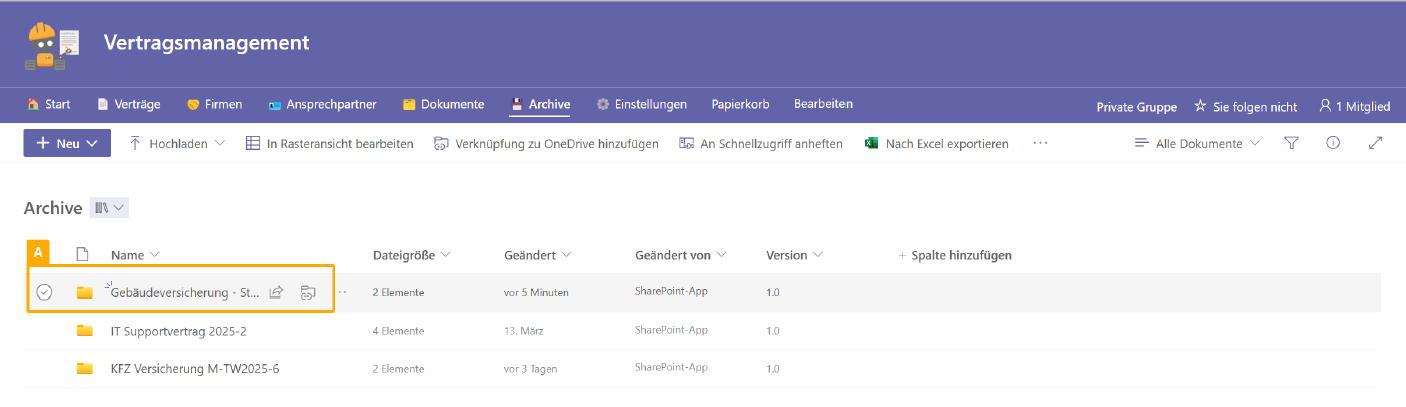 Hier ist nun der Dokumenten-Ordner zu dem gerade archivierten Vertrag „Gebäudeversicherung - Stadtstieg 4, München“ zu finden