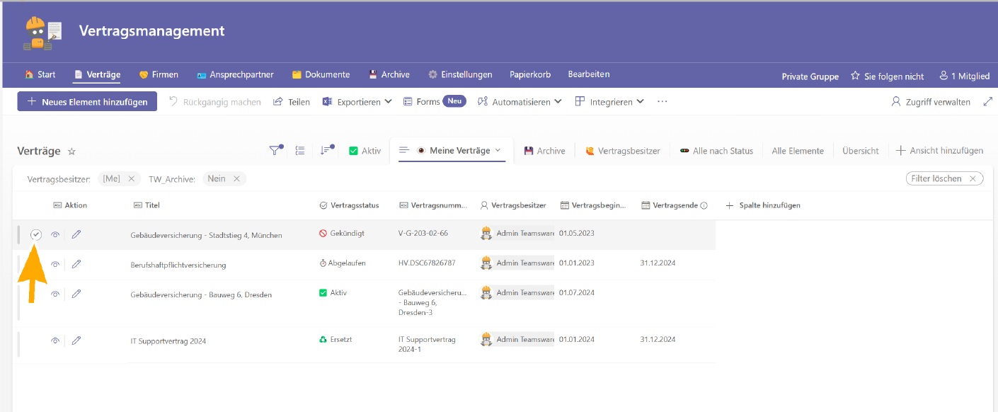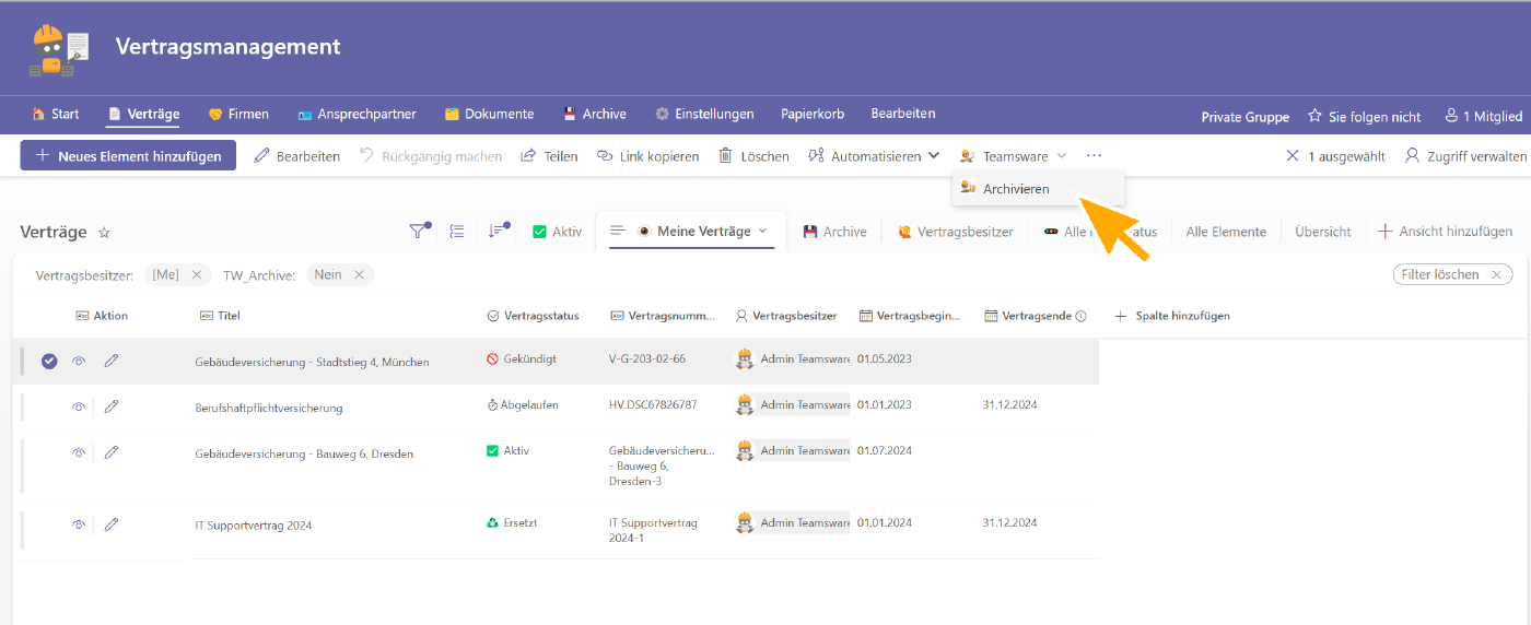 Markieren Sie einen Vertrag den sie archivieren möchten.
