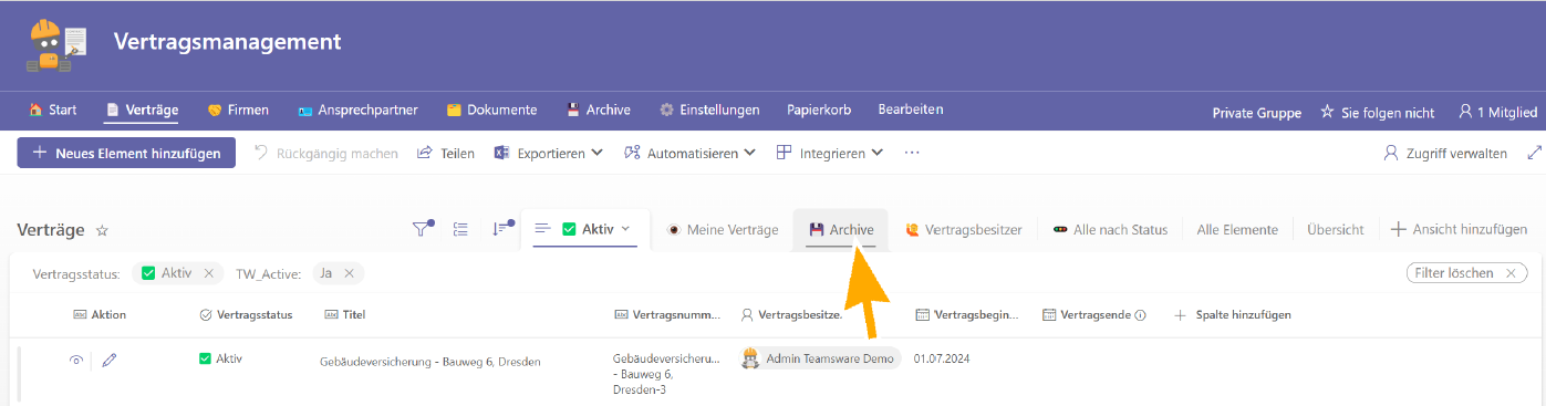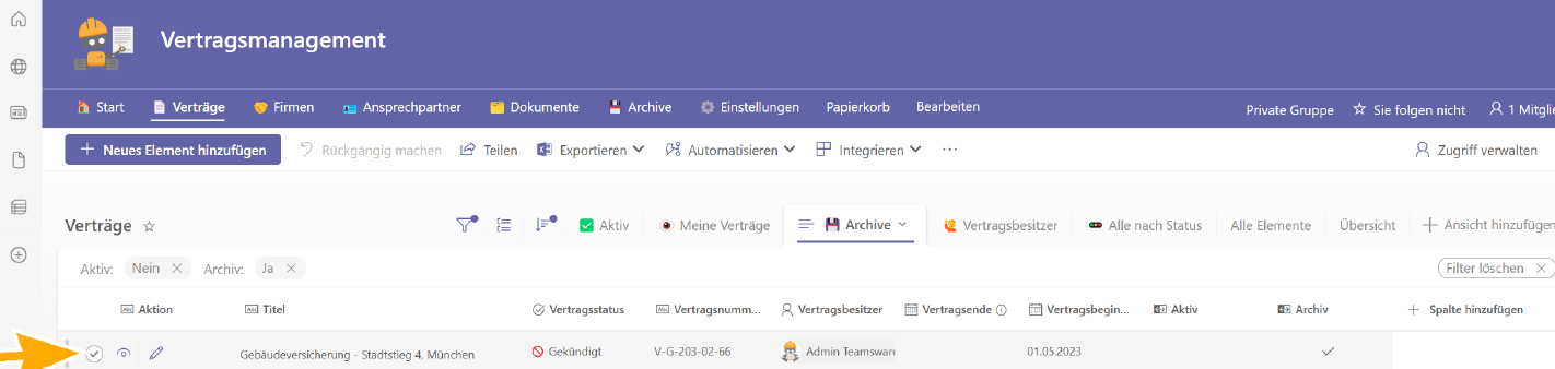 Hier wird der soeben archivierte Vertrag nun angezeigt
