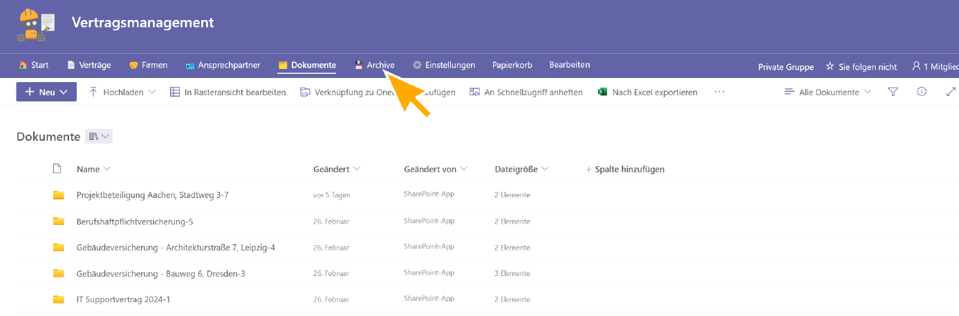 Der Dokumenten-Ordner zu dem archivierten Vertrag ist nicht mehr in den Dokumenten zu finden. Wechseln Sie daher zu „Archive“