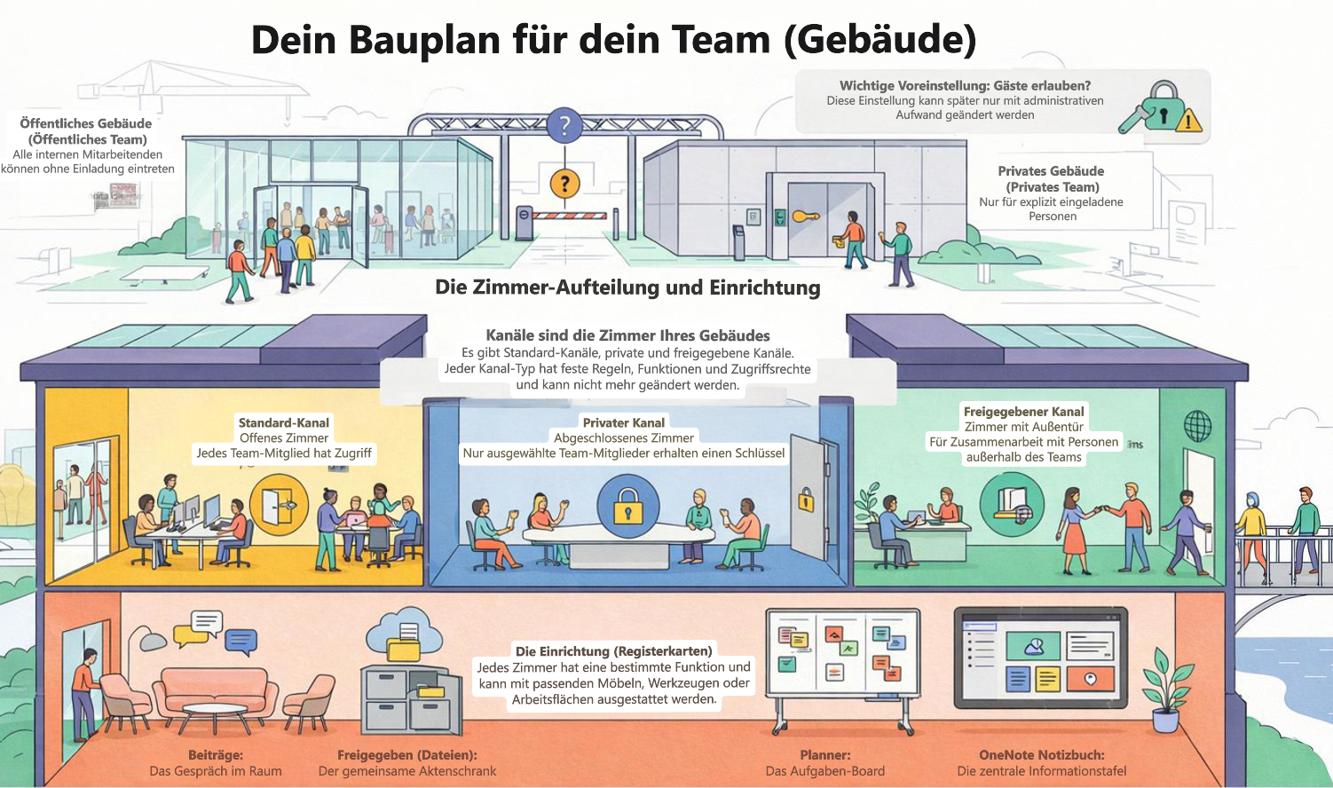 Stell dir die Microsoft Teams Umgebung wie ein Firmengelände vor, auf dem viele unterschiedliche Gebäude stehen.