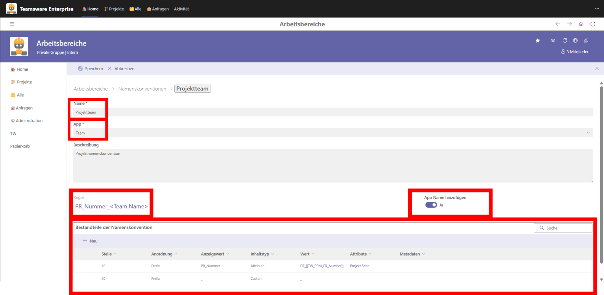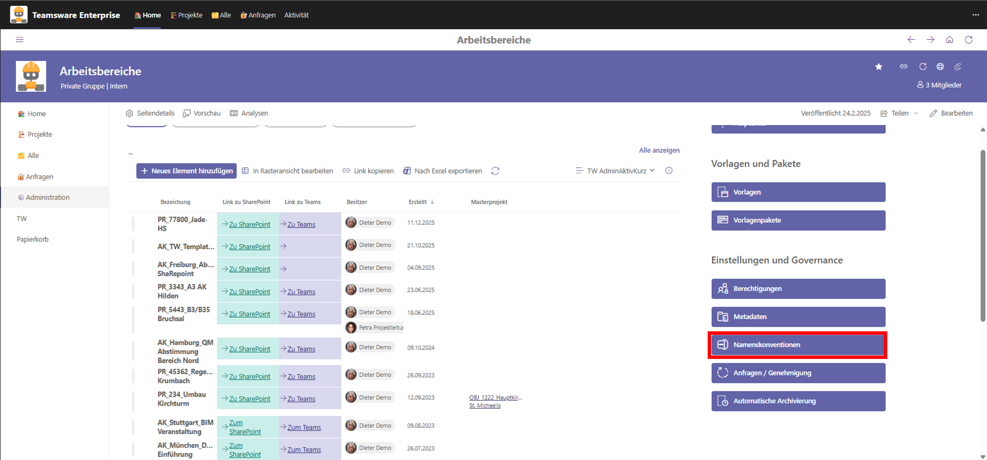 Consistent naming of your project rooms and document storage locations is crucial for clarity and governance. In the Teamsware Bauakte, you can define individual naming conventions for each application.
