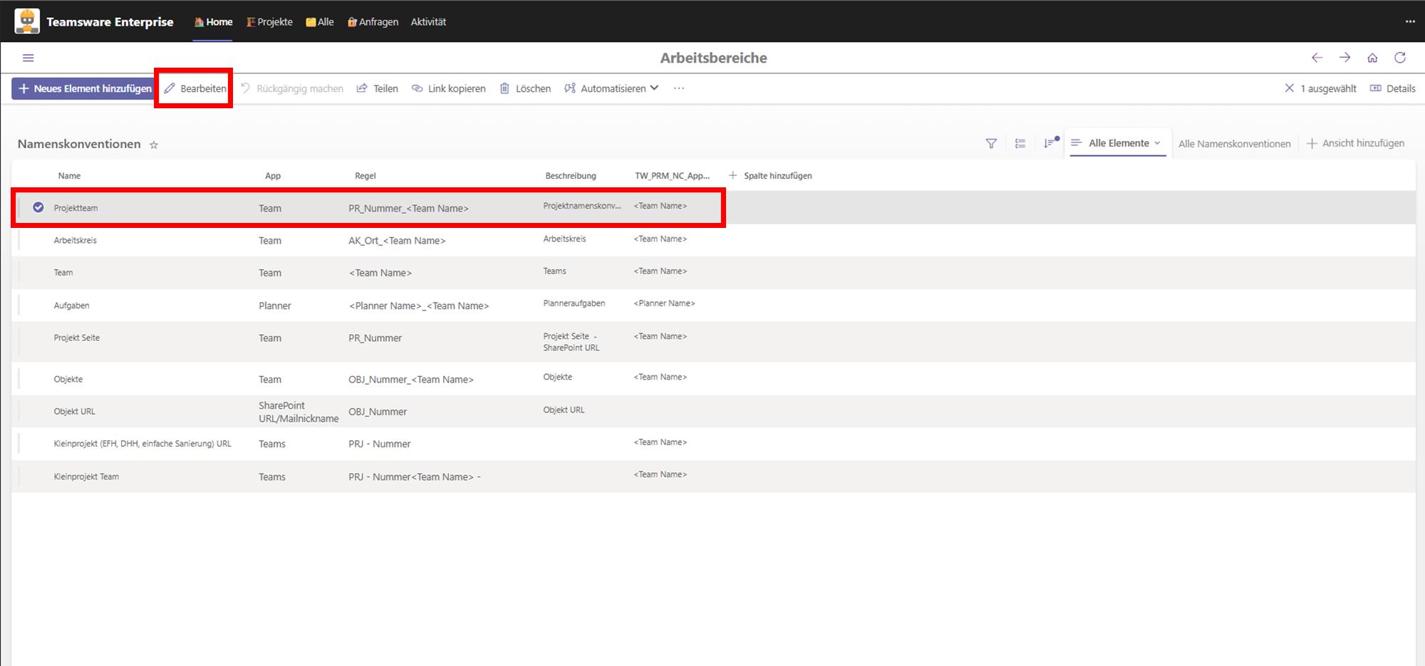 You will now see a list of all naming conventions already stored. Each rule is assigned to a specific App (e.g., Teams, Planner, or SharePoint). To adjust an existing rule, select the corresponding entry and click Edit in the top action bar.