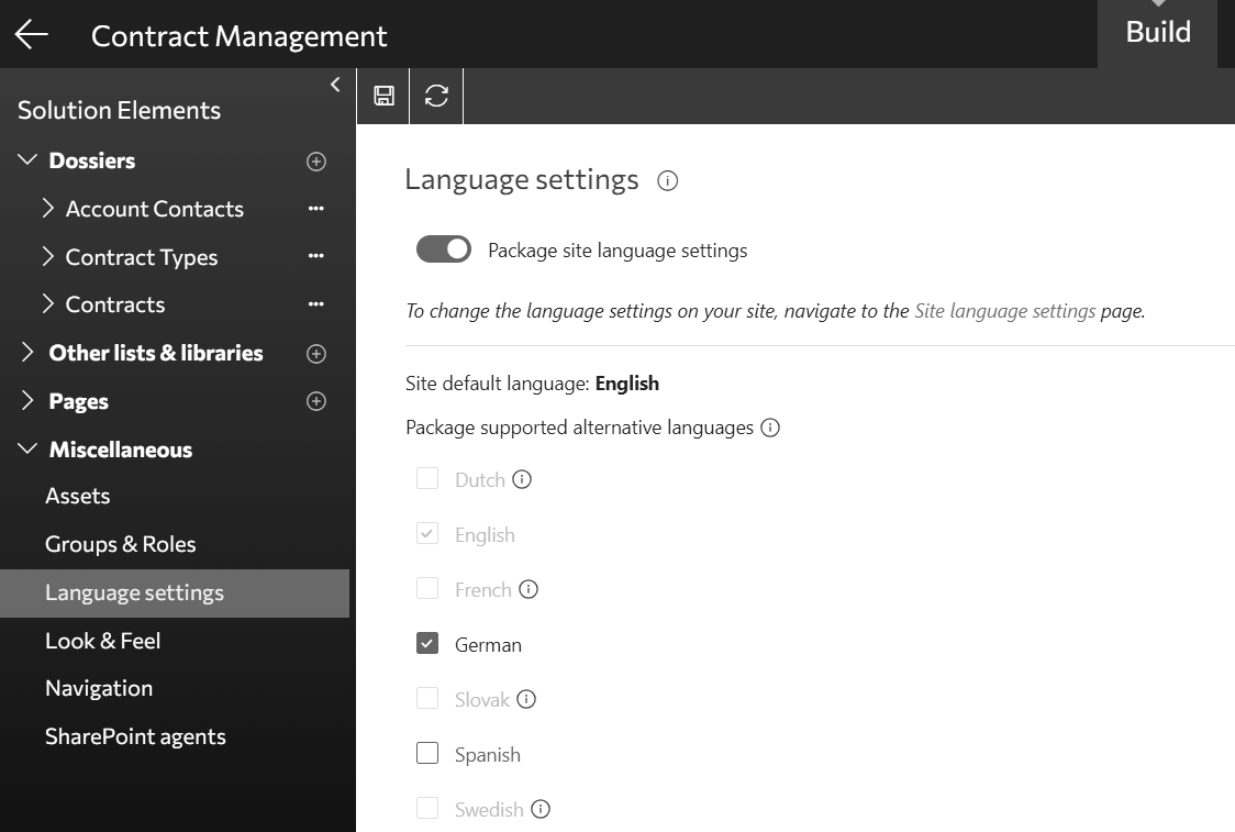 The Language settings option enables you to manage your solution's multi-lingual components (lists, libraries, columns, etc.) and deploy them using a supported languages to the target site. For more information, please read Provisioning of Language settings article.
